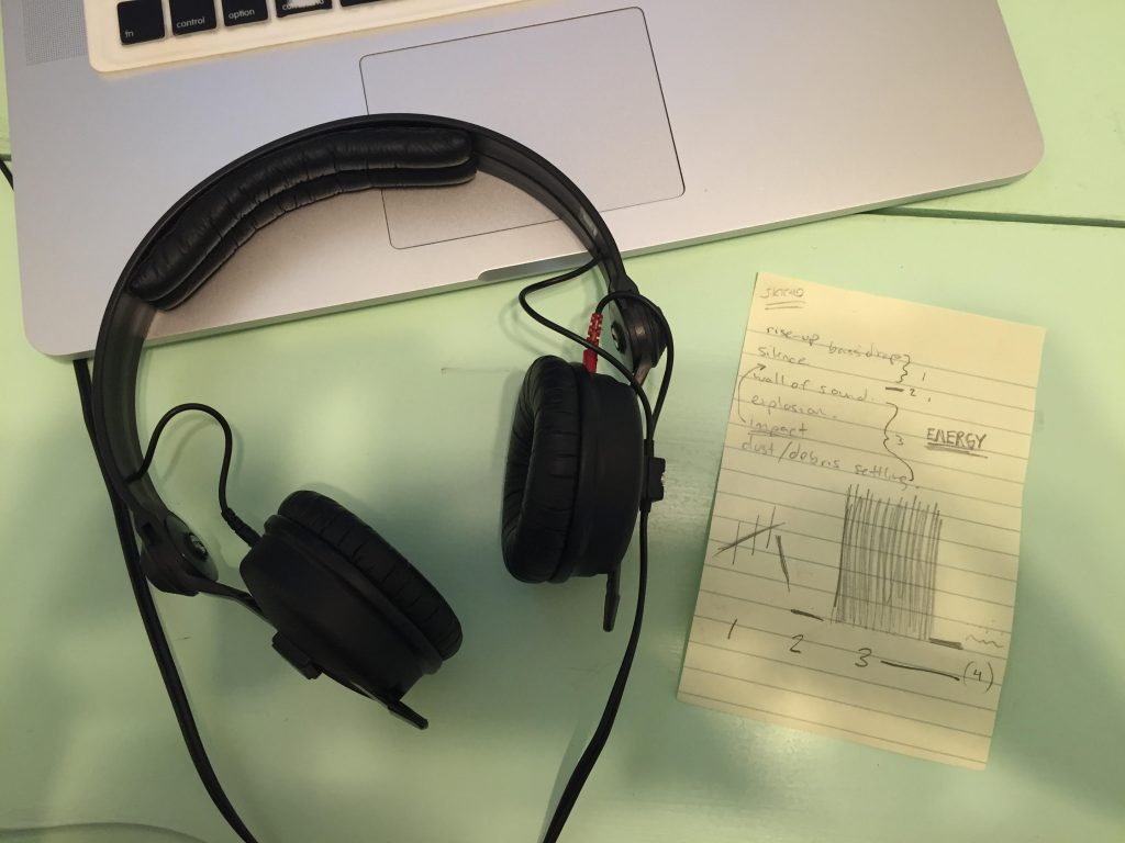CS: Like I mentioned earlier, I instinctively felt that this image was a very high-energy moment that required several parts to convey that energy and emotion. I wrote down some of the first ideas that came to mind when looking at the image, like “energy”, “wall of sound” and “debris”, and actually sketched out my initial thoughts in to a ‘graphic composition’ to guide me during my process. To me, the action on the page was conveying three “actions” – the build-up, the strike, and the resulting impact. From there it was experimenting with various sounds in my library to come up with the necessary parts to achieve the overall sound of each part.