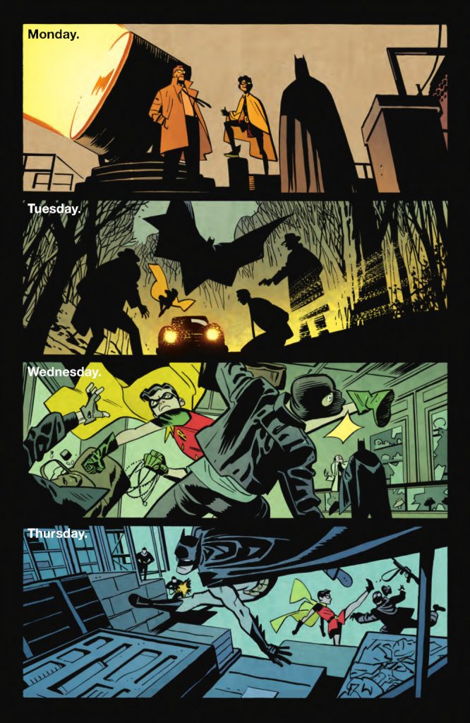 My favorite of the four, though, is Monday. Oddly, I sometimes love Samnee the most when he pulls the camera back and simplifies his character work even more. I love how he depicts Gordon and Robin there, as they’re boiled down to their key details but it’s still so obvious that it’s the two of them. One other thing I love is the choice to show the fronts of Gordon and Robin but the back of Batman. Sure, that’s just positioning, and a product of this type of conversation. But it also is storytelling. It speaks to how open those two are and how closed off The Dark Knight is. It’s brilliant work.