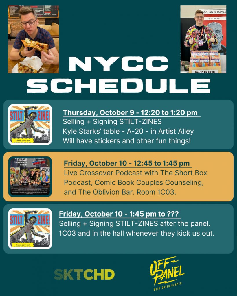 As you might know, the world’s first ever STILT-ZINE is coming soon, both at New York Comic Con and on the SKTCHD Big Cartel after the convention. Within this zine are five articles, an infographic by Chip Zdarsky, and five different takes on variations of Stilt-Man in a one-of-a-kind pinup gallery, with pieces by Liana Kangas, Jesse Lonergan, Declan Shalvey, Kyle Starks, and Phillip Sevy. It’s a ton of fun. Want a copy? Join me at one of the times listed below in my NYCC schedule!