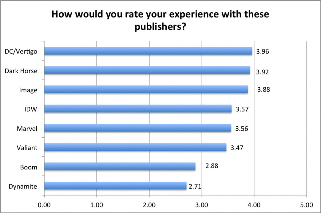 To continue the look at publishers from an artist’s perspective, respondents were asked to rate their experience with the same publishers that were featured in the page rate question. For this one, 1 means “Never work with them again,” 2 means “More bad than good,” 3 means “Middle of the Road,” 4 means “A quality experience,” and 5 means “One of the best.”