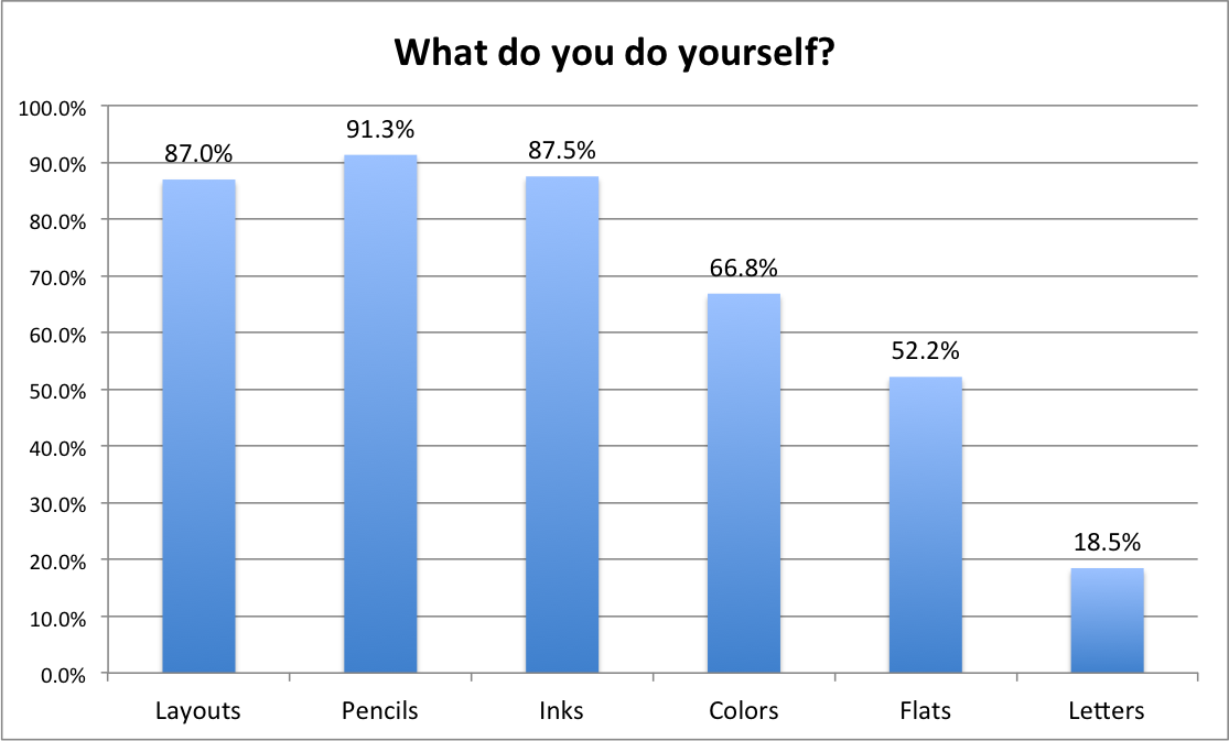 Each of these three graphs are interesting in their own right, but they work better in concert. There is a curious lack of artists who identified primarily as anything besides writer/artists, artists or colorists. By itself, that graph makes it seem like no inkers, flatters or letterers responded at all, but when you take a look at the second graph, a reason appears: many of the people who responded do almost everything themselves. Only 1.1% of respondents identified as inkers, but almost 88% of the artists ink themselves. They just don’t primarily identify as inkers.